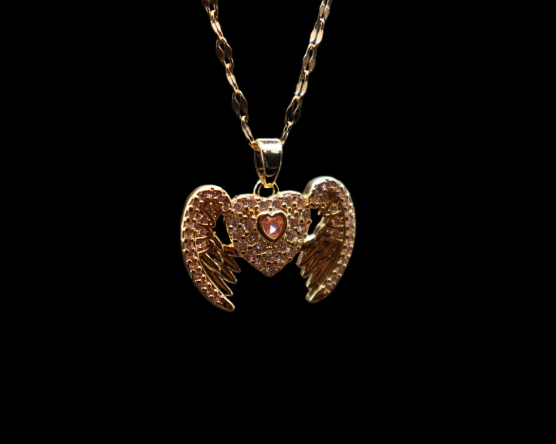 Amelia är ett halsband skapat för den som älskar subtil elegans med symbolisk styrka. De hjärtformade vingarna, pläterade i 18K guldfärg, representerar frihet, kärlek och lyftet mot nya höjder — en påminnelse om att du bär din egen kraft.