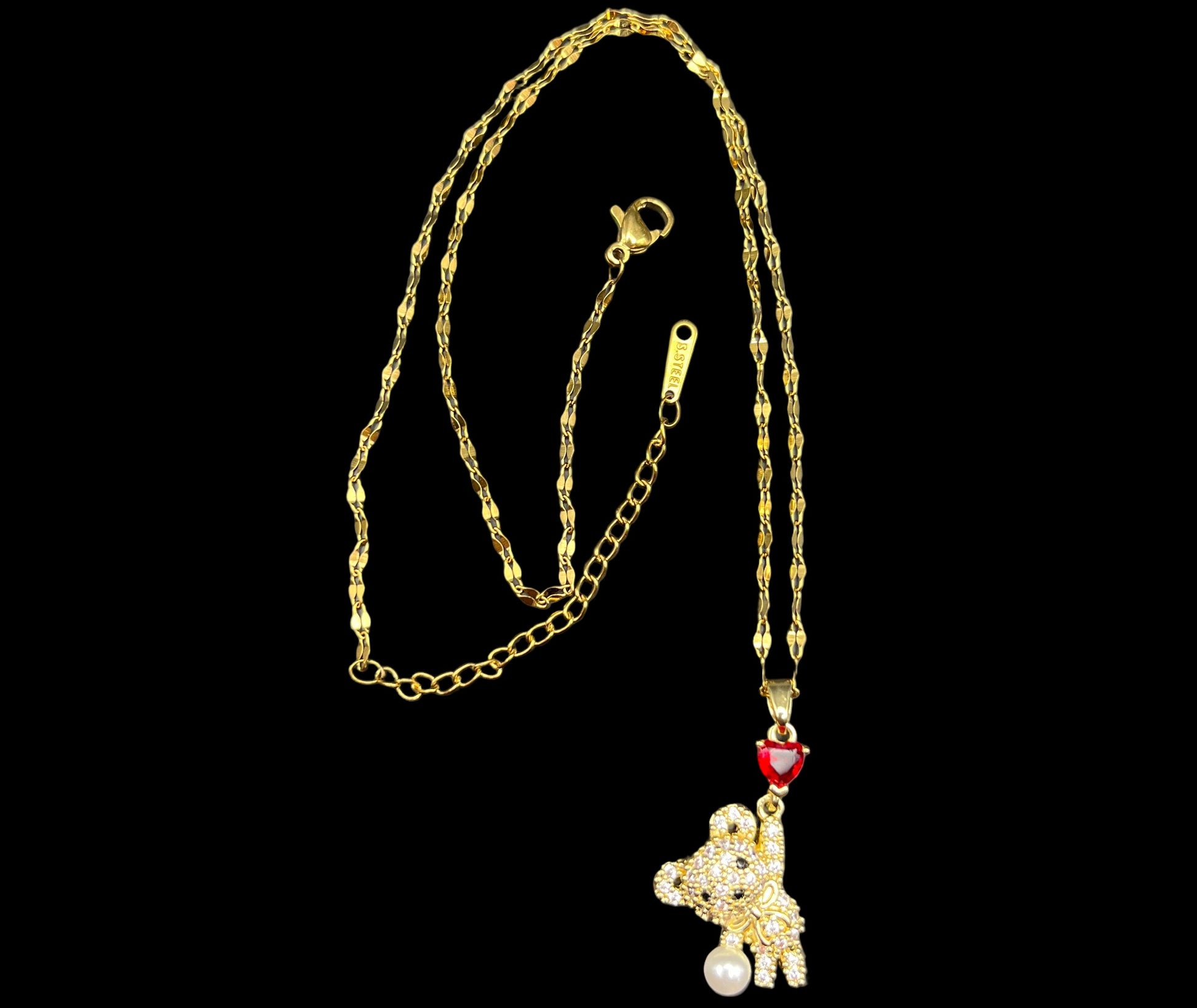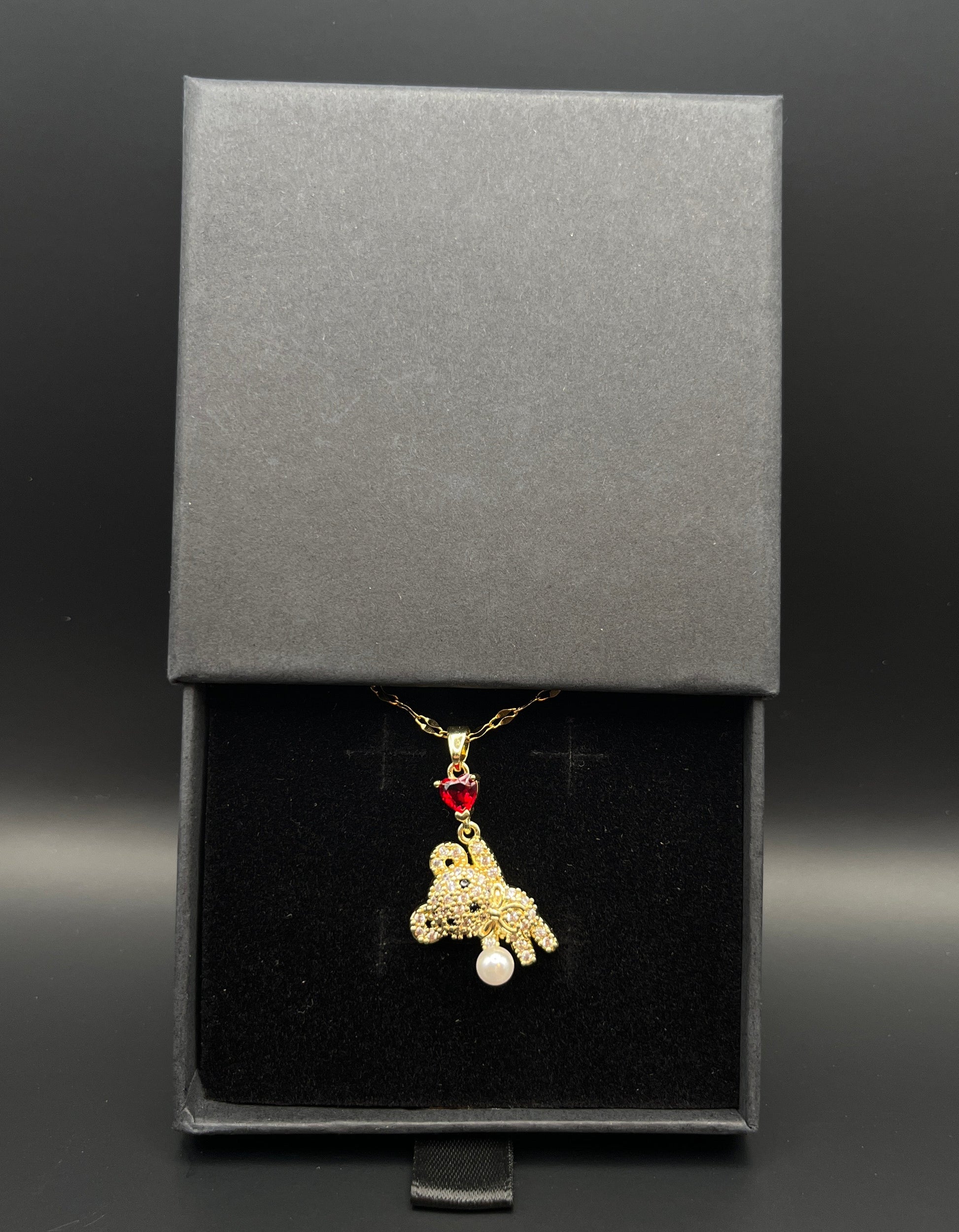 Esther Luxe är ett smycke skapat för den som vill bära något både mjukt och majestätiskt. Den detaljerade, guldfärgade björnen är utsmyckad med klara syntetiska zirkoner som fångar ljuset med subtil elegans, medan den hängande pärlan tillför en tidlös, feminin touch.